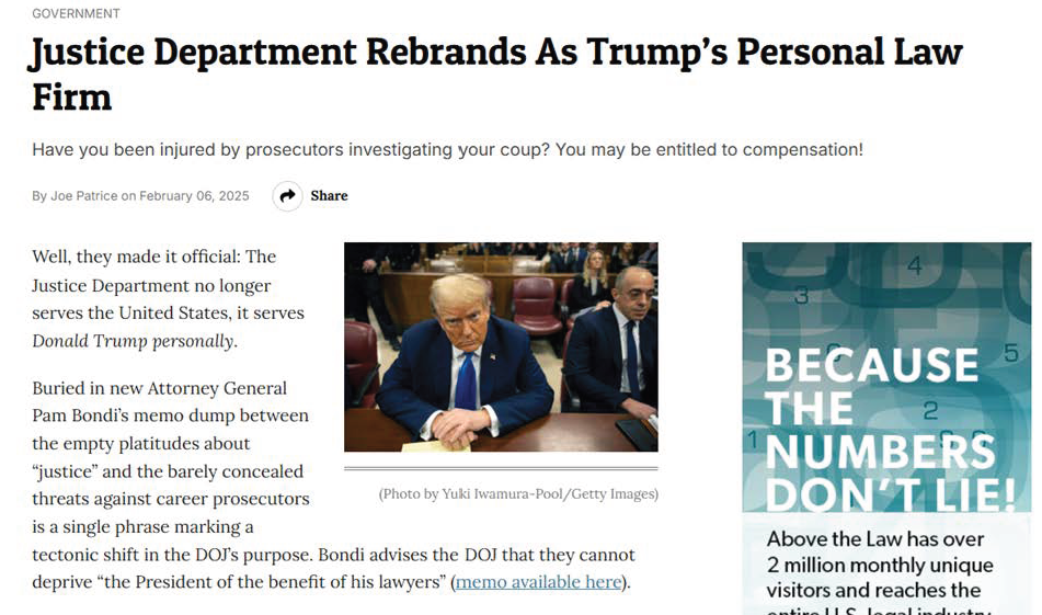AG BONDI REBRANDES DOJ: “NOW IT’S HIS LAW FIRM.”