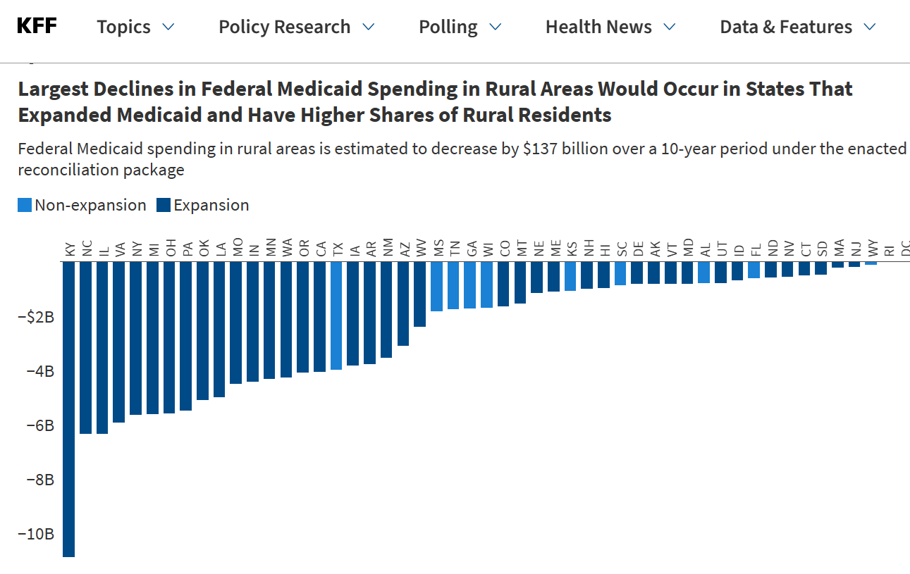Over half of the estimated federal spending cuts stem from provisions that only apply to states that have adopted the ACA expansions, including work requirements, more frequent eligibility determinations, and new cost-sharing requirements. As a result, the effects of the reconciliation bill in rural areas will be larger for expansion than for non-expansion states.