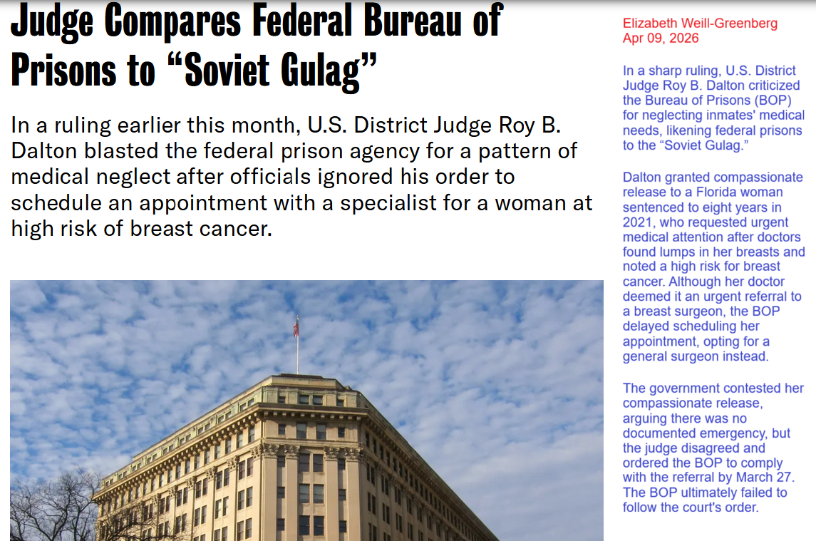 In United States v. Holland, No. 6:20‑cr‑86 (M.D. Fla. 2026), the court granted compassionate release where the Bureau of Prisons (“BOP”) failed to timely provide specialized medical care for a defendant facing a serious cancer risk. Although the defendant had received an urgent referral to a breast surgeon, the Government opposed release, asserting there was no documented emergency.